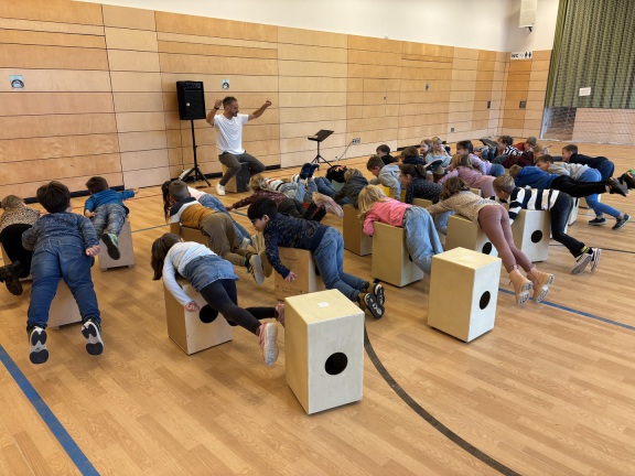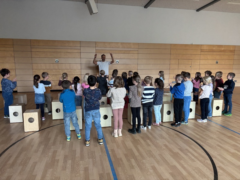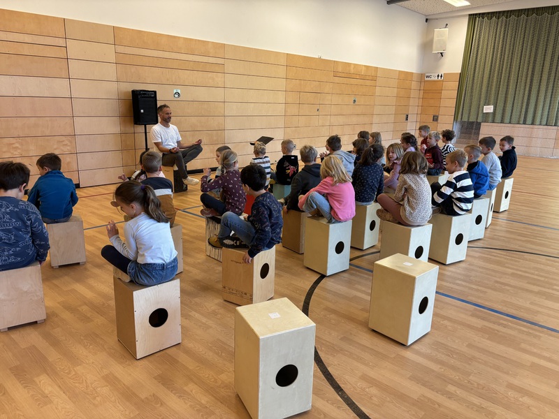 Am Mittwoch, den 1. Oktober 2025, fand ein Trommelworkshop in der Bürgerhalle Halsenbach für die beiden ersten Klassen statt. Unter der Leitung von David Anlauf durften die Kinder die Trommel als vielfältiges Instrument kennenlernen. Voller Aufregung suchten sich die Kinder zunächst eine eigene Trommel aus. Nach aktiven Aufwärmübungen trommelten die Kinder zu verschiedenen bekannten Liedern im Rhythmus mit. Es wurde dazu auch getanzt und gesungen. Zum Abschluss spielten alle das Spiel „Obstsalat“. Mit roten Wangen, geröteten Händen und einem Strahlen in den Kinderaugen beendete David Anlauf seinen Workshop. Wie immer eine tolles kurzweiliges Event!